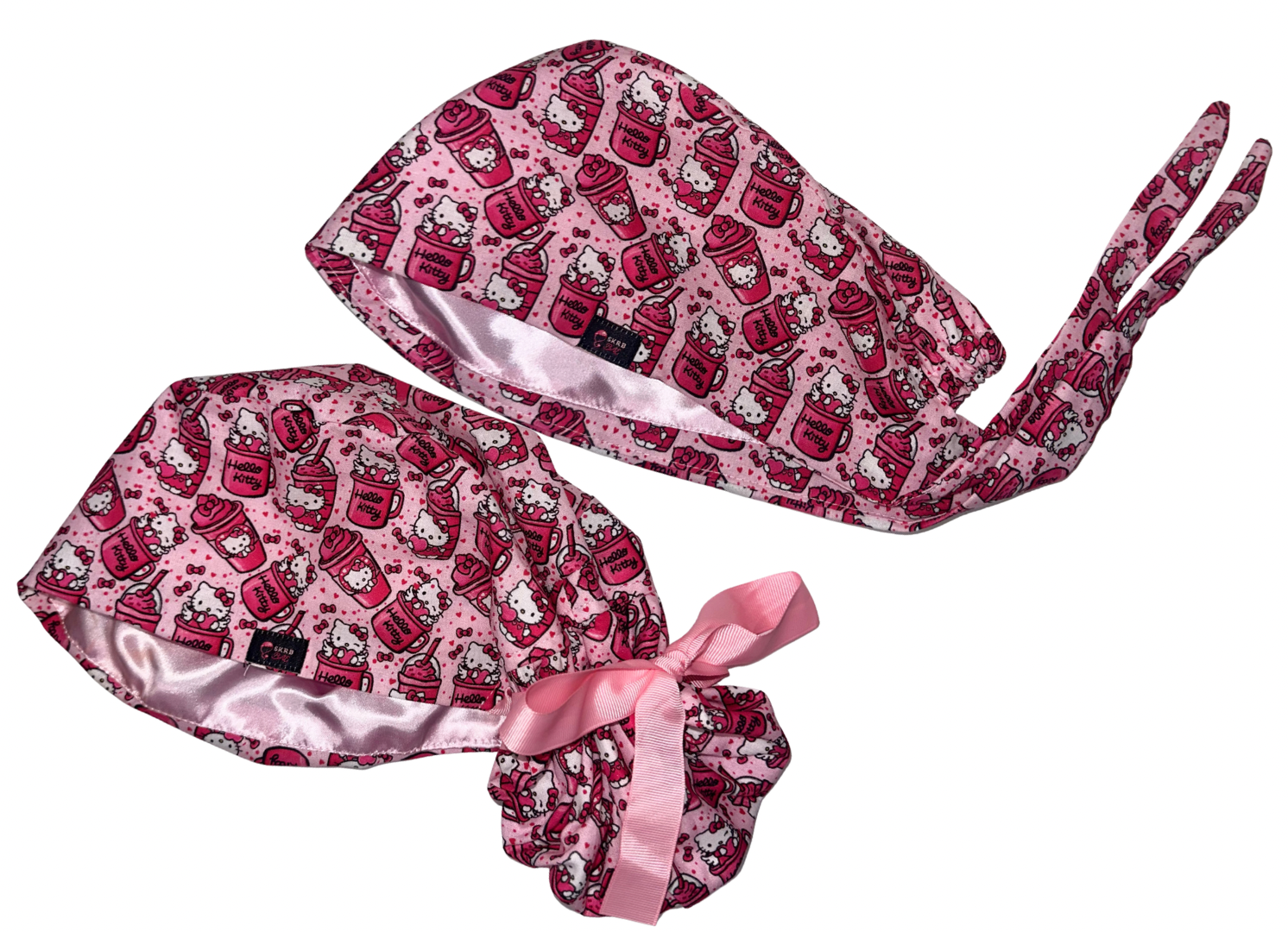 Bring sweet, café vibes to your shift with our Pink Kitty Latte satin-lined scrub cap. This adorable print features pink lattes, whipped drinks, and Hello-Kitty inspo — perfect for anyone who loves cute, fun workday style.